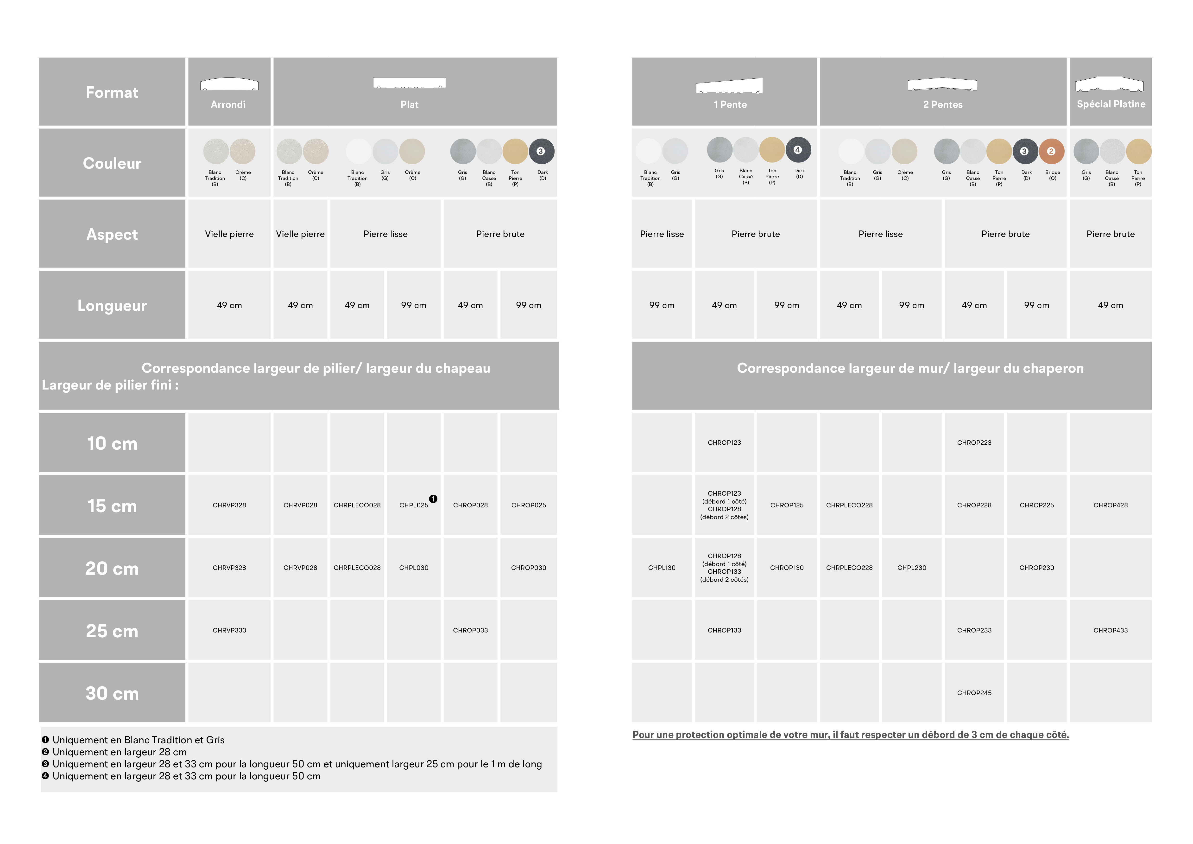 Le choix de vos couvertines en béton dépend de plusieurs critères essentiels. Pour vous guider, nous mettons à disposition un tableau complet des correspondances mur/chaperon.